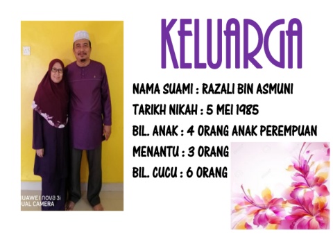 KELUARGA NAMA SUAMI : RAZALI BIN ASMUNI TARIKH NIKAH : 5 MEI 1985 BIL. ANAK : 4 ORANG ANAK PEREMPUAN MENANTU : 3 ORANG BIL. CUCU : 6 ORANG