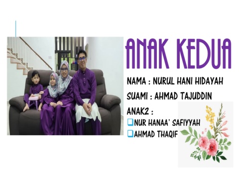 ANAK KEDUA NAMA : NURUL HANI HIDAYAH SUAMI : AHMAD TAJUDDIN ANAK2 : NUR HANAA’ SAFIYYAH AHMAD THAQIF