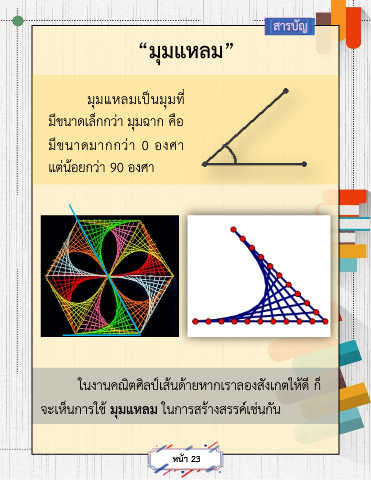 สารบัญ “มุมแหลม” มุมแหลมเป็นมุมท ี่ มีขนาดเล็กกว่า มุมฉาก คอ ื มีขนาดมากกว่า 0 องศา แต่น้อยกว่า 90 องศา ในงานคณิตศิลป์เส้นด้ายหากเราลองสังเกตให้ดี ก็ จะเห็นการใช มุมแหลม ในการสร้างสรรค์เช่นกัน ้ หน้า 23