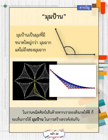 สารบัญ “มุมป้าน” มุมป้านเป็นมุมที่มี ขนาดใหญ่กว่า มุมฉาก แต่ไม่ถึงสองมุมฉาก ในงานคณิตศิลป์เส้นด้ายหากเราลองสังเกตให้ดี ก็ จะเห็นการใช มุมป้าน ในการสร้างสรรค์เช่นกัน ้ หน้า 24