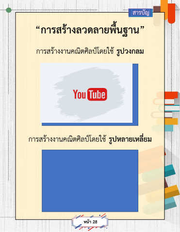 สารบัญ “การสร้างลวดลายพื้นฐาน” การสร้างงานคณิตศิลป์โดยใช้ รูปวงกลม การสร้างงานคณิตศิลป์โดยใช้ รูปหลายเหลี่ยม หน้า 28