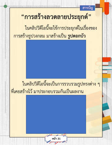 สารบัญ “การสร้างลวดลายประยุกต์” ในคลิปวิดีโอนี้จะใช้การประยุกต์ในเรื่องของ การสร้างรูปวงกลม มาสร้างเป็น รูปดอกบัว ในคลิปวิดีโอนี้จะเป็นการรวบรวมรูปทรงต่าง ๆ ที่เคยสร้างไว้ มาประกอบรวมกันเป็นผลงาน หน้า 31