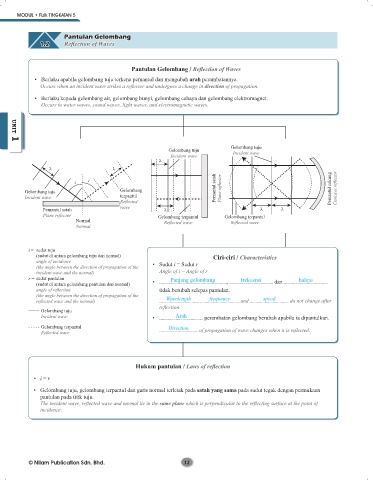 • Gelombang tuju, gelombang terpantul dan garis normal terletak pada satah yang sama pada sudut tegak dengan permukaan