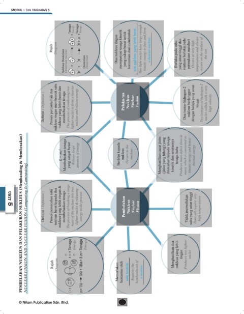 Rajah Diagram Dua nukleus ringan mempunyai tenaga kinetik yang cukup besar untuk bercantum dan membentuk satu nukleus yang lebih berat. Two light nuclei have large enough kinetic energy to fuse and form a heavier nucleus. Berlaku pada suhu yang amat tinggi dan sentiasa berlaku pada permukaan matahari Occurs at very high temperatures and always occurs on the surface of the sun