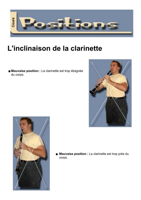 L'inclinaison de la clarinette l Mauvaise position : La clarinette est trop éloignée du corps. Mauvaise position : La clarinette est trop près du l corps.