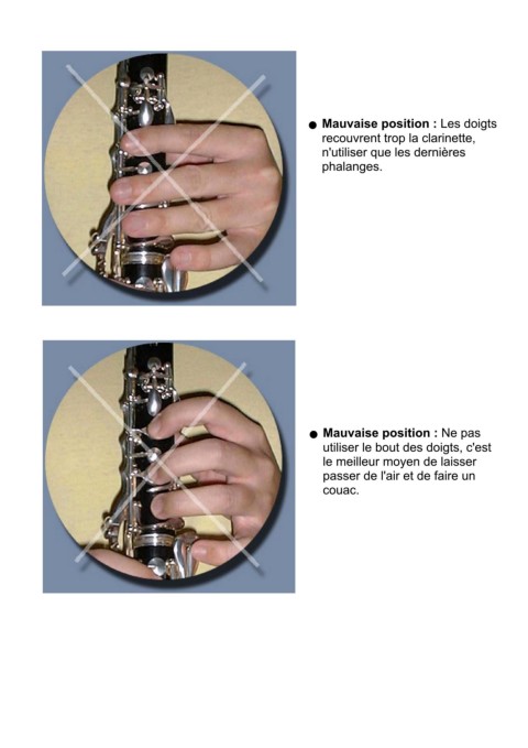 Mauvaise position : Les doigts l recouvrent trop la clarinette, n'utiliser que les dernières phalanges. Mauvaise position : Ne pas l utiliser le bout des doigts, c'est le meilleur moyen de laisser passer de l'air et de faire un couac.