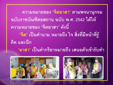 ความหมายของ “จิตอาสา” ตามพจนานกรม ุ ฉบับราชบัณฑิตยสถาน ฉบับ พ.ศ. 2542 ได้ให้ ความหมายของ “จิตอาสา” ดังน้ ี ็ ้ “จิต” เปนค านาม หมายถึง ใจ สิ่งที่มีหนาที่รู้ คิด และนก ึ ั ็ “อาสา” เปนค ากริยาหมายถึง เสนอตัวเข้ารบท า