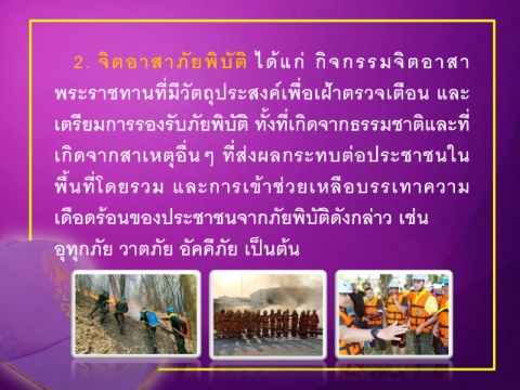 2. จิตอาสาภัยพิบัติ ได้แก่ กิจกรรมจิตอาสา