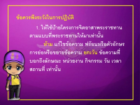 ข้อควรพึงระวังในการปฏิบัติ 1. ให้ใชปายโครงการจิตอาสาพระราชทาน ้ ้ ตามแบบที่พระราชทานให้มาเท่าน้น ั ้ ห้าม แก้ไขข้อความ ฟรอนหรือตัวอักษร การย่อหรอขยายขอความ ยกเว้น ขอความที่ ้ ้ ื ั บอกถึงลกษณะ หนวยงาน กิจกรรม วัน เวลา ่ ั สถานที่ เท่าน้น