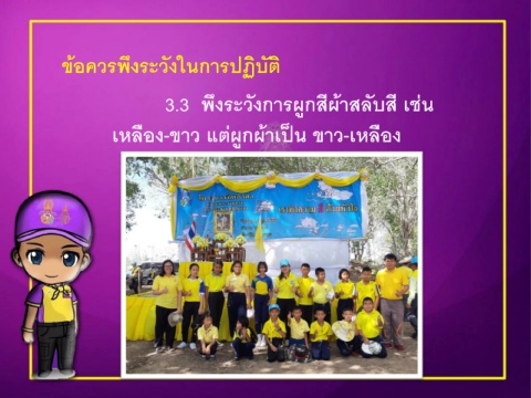 ข้อควรพึงระวังในการปฏิบัติ ั ี ้ ่ 3.3 พึงระวังการผูกสผาสลบส เชน ี เหลือง-ขาว แต่ผูกผาเปน ขาว-เหลือง ้ ็