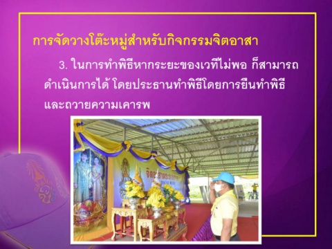 ั ่ การจัดวางโต๊ะหมูส าหรบกิจกรรมจิตอาสา ี 3. ในการท าพิธหากระยะของเวทีไม่พอ ก็สามารถ ี ด าเนนการได้ โดยประธานท าพิธโดยการยืนท าพิธี ิ และถวายความเคารพ