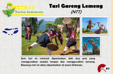 Tari Gareng Lemeng (NTT) Jenis tari ini minimal dipentaskan oleh dua pria yang menggunakan senjata tangan dan menggunakan tameng. Biasanya tari ini akan dipentaskan di acara khitanan. 27