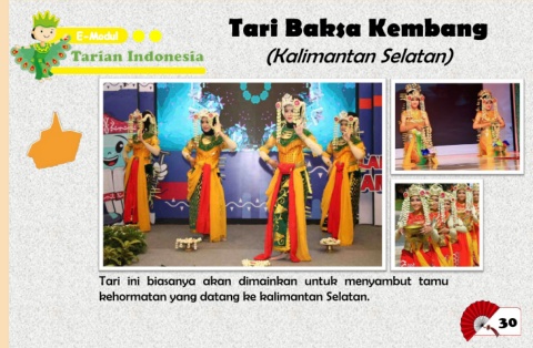 Tari Baksa Kembang (Kalimantan Selatan) Tari ini biasanya akan dimainkan untuk menyambut tamu kehormatan yang datang ke kalimantan Selatan. 30