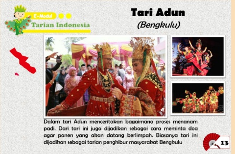 Tari Adun (Bengkulu) Dalam tari Adun menceritakan bagaimana proses menanam padi. Dari tari ini juga dijadikan sebagai cara meminta doa agar panen yang akan datang berlimpah. Biasanya tari ini dijadikan sebagai tarian penghibur masyarakat Bengkulu 13