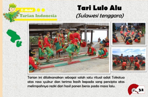 Tari Lulo Alu (Sulawesi tenggara) Tarian ini dilaksanakan sebagai salah satu ritual adat Tokotua atas rasa syukur dan terima kasih kepada sang pencipta atas melimpahnya rezki dari hasil panen beras pada masa lalu. 32