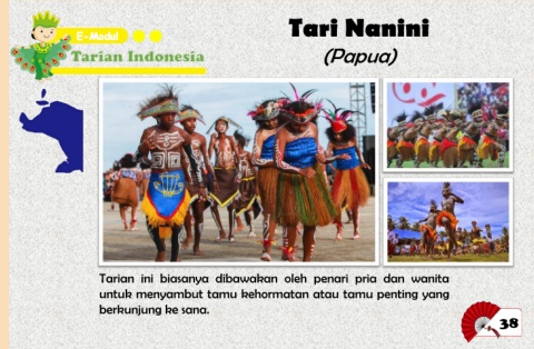 Tari Nanini (Papua) Tarian ini biasanya dibawakan oleh penari pria dan wanita untuk menyambut tamu kehormatan atau tamu penting yang berkunjung ke sana. 38