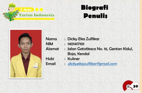 Biografi Penulis Nama : Dicky Eka Zulfikar NIM : 1401417101 Alamat : Jalan Gatotkaca No. 16, Gentan Kidul, Boja, Kendal Hobi : Kuliner Email : dickyekazulfikar@gmail.com 39