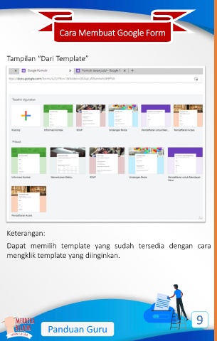 Cara Membuat Google Form Tampilan “Dari Template” 1 Keterangan: Dapat memilih template yang sudah tersedia dengan cara mengklik template yang diinginkan. 9 Panduan Guru