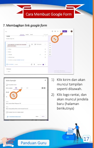 Cara Membuat Google Form 7. Membagikan link google form 1) Klik kirim dan akan muncul tampilan seperti dibawah. 2) Klik logo rantai, dan akan muncul jendela baru (halaman berikutnya) 17 Panduan Guru