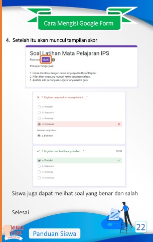 Cara Mengisi Google Form 4. Setelah itu akan muncul tampilan skor Siswa juga dapat melihat soal yang benar dan salah Selesai 22 Panduan Siswa