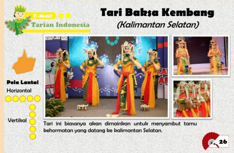 Tari Baksa Kembang (Kalimantan Selatan) Pola Lantai Horizontal Vertikal Tari ini biasanya akan dimainkan untuk menyambut tamu kehormatan yang datang ke kalimantan Selatan. 26