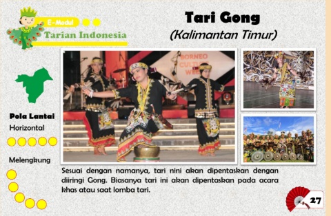 Tari Gong (Kalimantan Timur) Pola Lantai Horizontal Melengkung Sesuai dengan namanya, tari nini akan dipentaskan dengan diiringi Gong. Biasanya tari ini akan dipentaskan pada acara khas atau saat lomba tari. 27