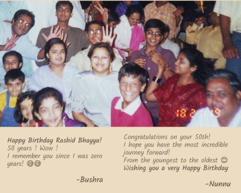 Congratulations on your 50th! Happy Birthday Rashid Bhayya! I hope you have the most incredible 50 years ! Wow ! journey forward! I remember you since I was zero From the youngest to the oldest years! Wishing you a very Happy Birthday -Bushra -Nunnu