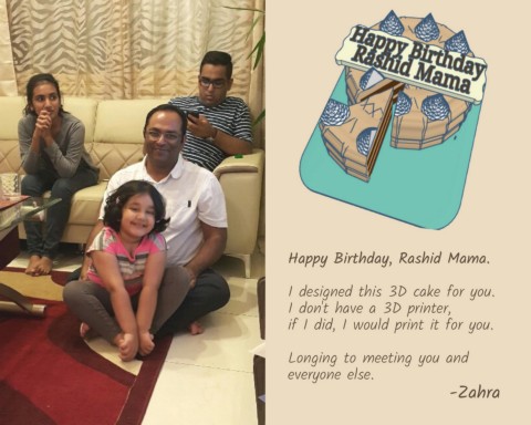 Happy Birthday, Rashid Mama. I designed this 3D cake for you. I don't have a 3D printer, if I did, I would print it for you. Longing to meeting you and everyone else. -Zahra