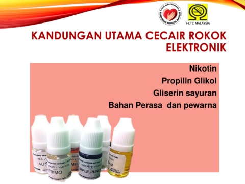 KANDUNGAN UTAMA CECAIR ROKOK ELEKTRONIK Nikotin Propilin Glikol Gliserin sayuran Bahan Perasa dan pewarna