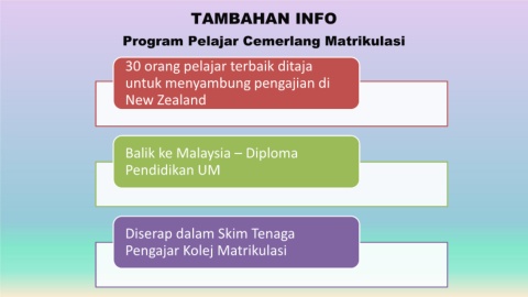 TAMBAHAN INFO Program Pelajar Cemerlang Matrikulasi 30 orang pelajar terbaik ditaja untuk menyambung pengajian di New Zealand Balik ke Malaysia – Diploma Pendidikan UM Diserap dalam Skim Tenaga Pengajar Kolej Matrikulasi