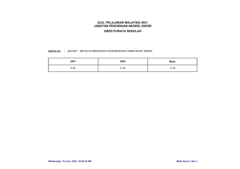 SIJIL PELAJARAN MALAYSIA 2021 JABATAN PENDIDIKAN NEGERI JOHOR GRED PURATA SEKOLAH SEKOLAH : JEA1087 - SEKOLAH MENENGAH KEBANGSAAN TAMAN BUKIT INDAH 2021 2020 Beza 5.00 5.19 0.19 Wednesday, 15 June, 2022 10:54:34 AM Muka Surat 1 dari 1
