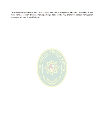 *Apabila terdapat pelayanan yang membutuhkan waktu lebih sebagaimana yang telah ditentukan di atas, maka Pencari Keadilan dimohon menunggu hingga batas waktu yang ditentukan dengan meninggalkan contact person yang dapat di hubungi.