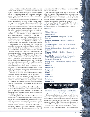 His contact with God had driven him to an insane fervor, but Physical Skills: Brawl 2, Drive 2, Larceny 2,