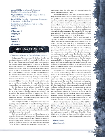 Physical Skills: Athletics (Running) 3, Drive 2, Description: Melissa Charles is a quiet introvert. She care-
