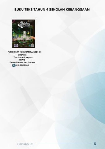 BUKU TEKS TAHUN 4 SEKOLAH KEBANGSAAN PENDIDIKAN KESENIAN TAHUN 4 SK BT194001 Zon: Seluruh Negara RM7.10 Dewan Bahasa dan Pustaka 03- 21479000 6 e-Katalog Buku Teks