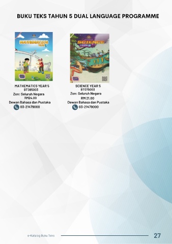 BUKU TEKS TAHUN 5 DUAL LANGUAGE PROGRAMME MATHEMATICS YEAR 5 SCIENCE YEAR 5 BT085003 BT075003 Zon: Seluruh Negara Zon: Seluruh Negara RM24.00 RM 21.00 Dewan Bahasa dan Pustaka Dewan Bahasa dan Pustaka 03-21479000 03-21479000 27 e-Katalog Buku Teks