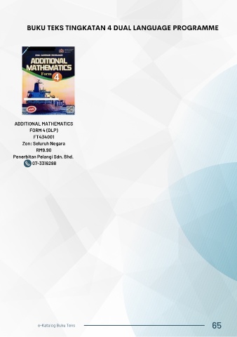 BUKU TEKS TINGKATAN 4 DUAL LANGUAGE PROGRAMME ADDITIONAL MATHEMATICS FORM 4 (DLP) FT434001 Zon: Seluruh Negara RM9.90 Penerbitan Pelangi Sdn. Bhd. 07-3316288 65 e-Katalog Buku Teks
