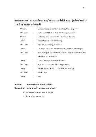 ตัวอยางบทสนทนา Mr. Kane โทรหา Judy โดย operator ตอไปที่ Jannie ผูรับโทรศัพทแจงวา