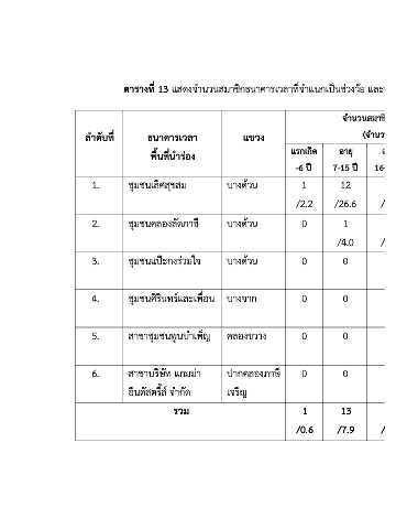 ตารางท 13 แสดงจำนวนสมาชิกธนาคารเวลาที่จำแนกเป8นช9วงวัย และจำนวนชั่วโมงการแลกเปลี่ยนทักษะ