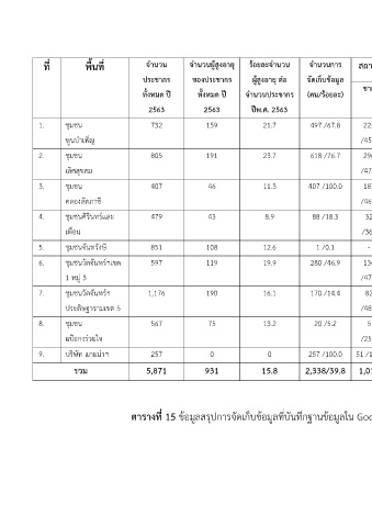 ตารางท 15 ข#อมูลสรุปการจัดเก็บข#อมูลที่บันทึกฐานข#อมูลใน Google form 9 พื้นที่นำรHองธนาคารเวลาสำหรับทุกกลุHมวัยภาษีเจริญ