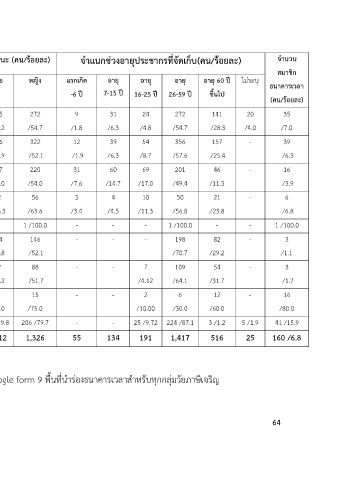 ตารางท 15 ข#อมูลสรุปการจัดเก็บข#อมูลที่บันทึกฐานข#อมูลใน Google form 9 พื้นที่นำรHองธนาคารเวลาสำหรับทุกกลุHมวัยภาษีเจริญ
