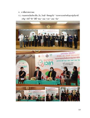 4. การสื่อสารสาธารณะ ั 4.1. งานมหกรรมไฮบริด สปyด...รับ...วิกฤติ “สังคมสูงวัย” “ธนาคารเวลาสำหรบทุกกลุCมวัยภาษี ิ เจริญ” ทำที่ “ใชC” ให+ที่ “ชอบ” ออม “เวลา” แทน “เงน” 125