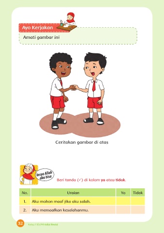 Amati gambar ini Ceritakan gambar di atas Insya Allah Beri tanda () di kolom ya atau tidak. aku bisa No. Uraian Ya Tidak 1. Aku mohon maaf jika aku salah. 2. Aku memaafkan kesalahanmu. 32 Kelas I SD/MI Edisi Revisi