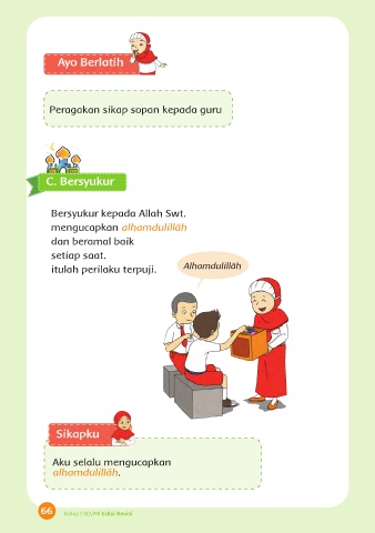 Peragakan sikap sopan kepada guru C. Bersyukur Bersyukur kepada Allah Swt. mengucapkan alhamdulillãh dan beramal baik setiap saat. itulah perilaku terpuji. Alhamdulillãh Aku selalu mengucapkan alhamdulillãh. 66 Kelas I SD/MI Edisi Revisi