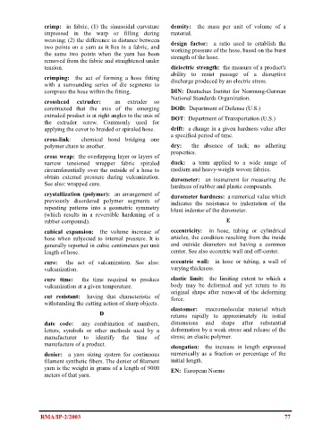 crimp: in fabric, (1) the sinusoidal curvature density: the mass per unit of volume of a