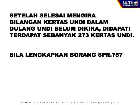 SETELAH SELESAI MENGIRA BILANGAN KERTAS UNDI DALAM DULANG UNDI BELUM DIKIRA, DIDAPATI TERDAPAT SEBANYAK 273 KERTAS UNDI. SILA LENGKAPKAN BORANG SPR.757