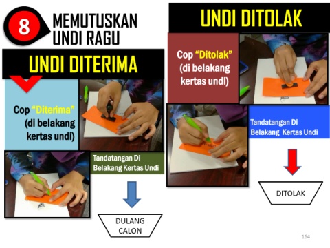 8 MEMUTUSKAN UNDI DITOLAK UNDI RAGU UNDI DITERIMA Cop “Ditolak” (di belakang kertas undi) Cop “Diterima” (di belakang Tandatangan Di kertas undi) Belakang Kertas Undi Tandatangan Di Belakang Kertas Undi DITOLAK DULANG CALON 164