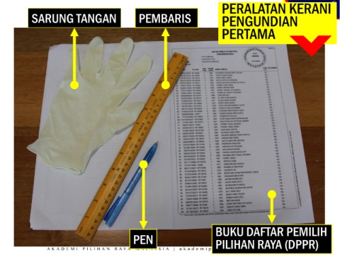 PERALATAN KERANI SARUNG TANGAN PEMBARIS PENGUNDIAN PERTAMA BUKU DAFTAR PEMILIH PEN PILIHAN RAYA (DPPR)