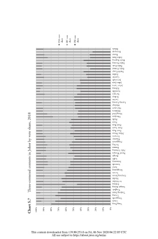 Chart 5.7 ree-cornered contests in Johor by vote share, 2018 100% 90% 80% 70% 60% 50% 40% 30% 20% 10% 0% Panti Senai Sedili Tiram Rengit Serom Perling Skudai Permas Stulang Tenang Pemanis Penawar Semerah Tangkak Parit Raja Pasir Raja Semarang Sri Medan Tenggaroh Yong Peng Parit Yaani Penggaram Seng