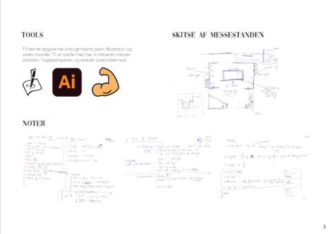 TOOLS SKITSE AF MESSESTANDEN Til denne opgave har vi brugt blyant, papir, Illustrator, og vores muskler. Til at starte med har vi skitseret messe- standen, i fugleperspektiv, og skrevet vores idéer ned. NOTER 3